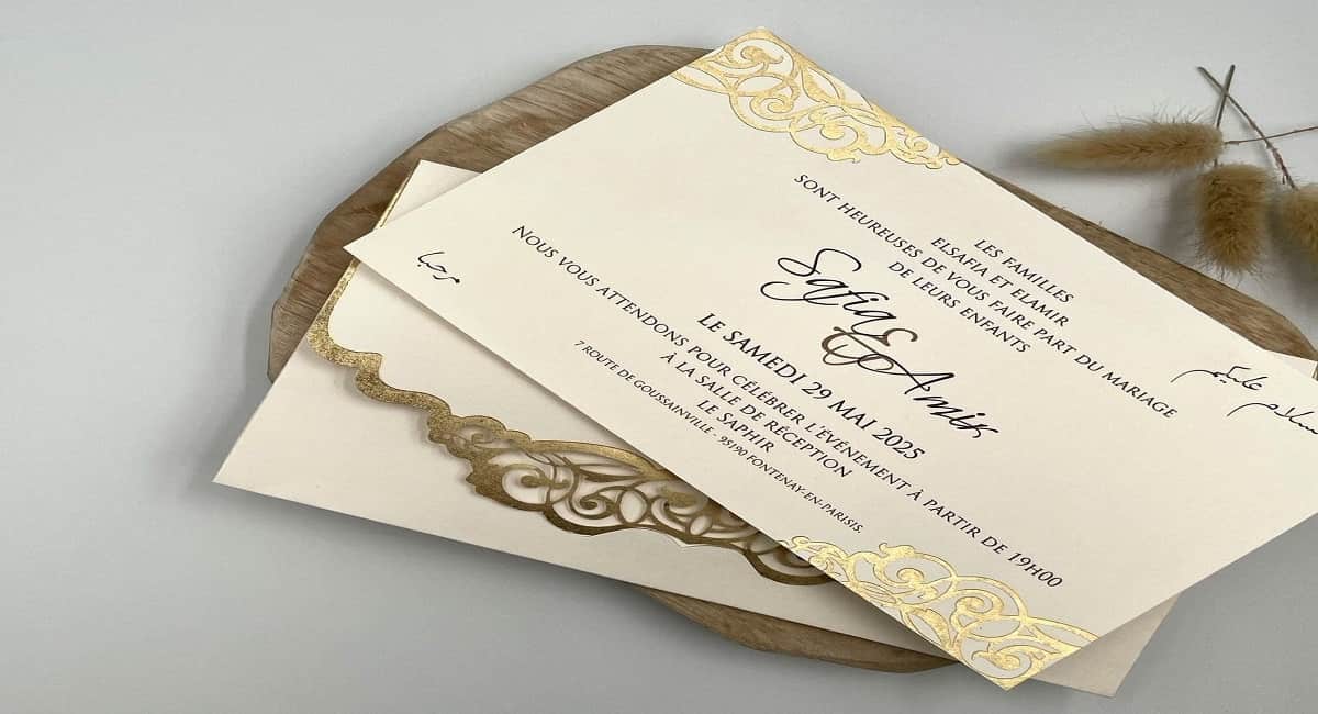 Pour une cérémonie plus contemporaine, le papier mat haut de gamme ou le satiné séduisent par leur élégance discrète. Ces choix conviennent à un mariage oriental moderne où minimalisme rime avec raffinement. L’impression sobre, souvent en ton sur ton ou avec des motifs géométriques inspirés du zellige, sublime ce type de support.